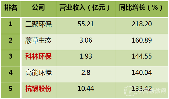 表2 2017年一季度中國(guó)環(huán)保上市企業(yè)營(yíng)業(yè)收入增速TOP5
