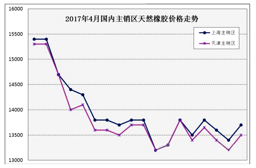 以下為4月國內(nèi)主銷區(qū)天然橡膠價(jià)格走勢(shì):